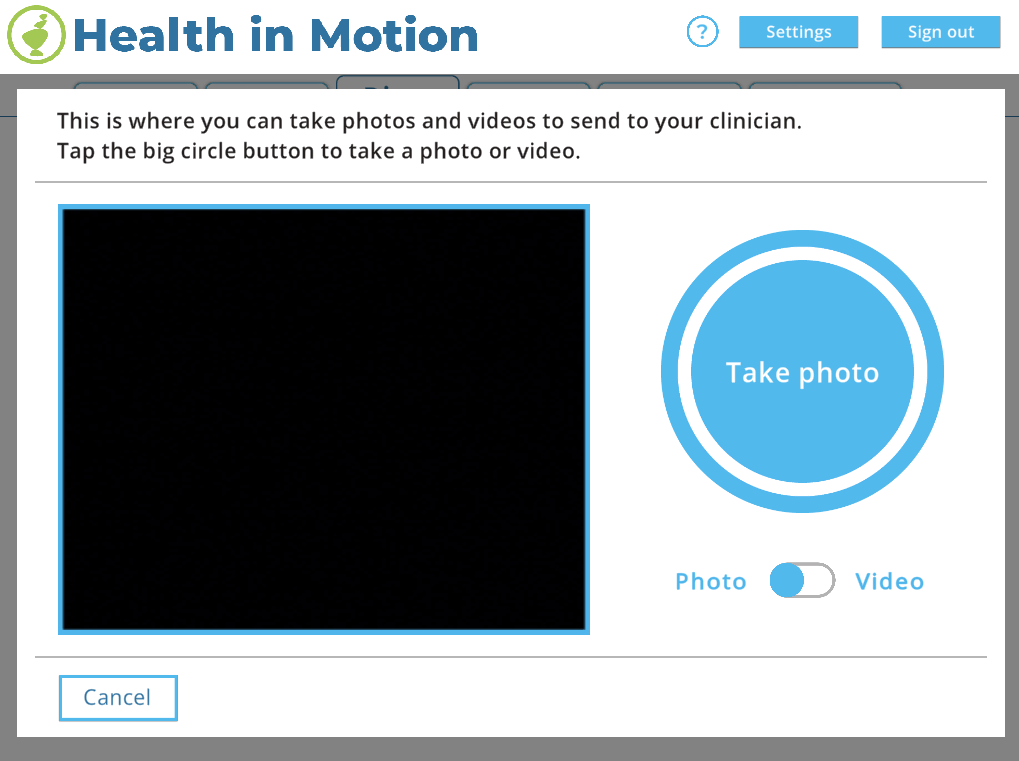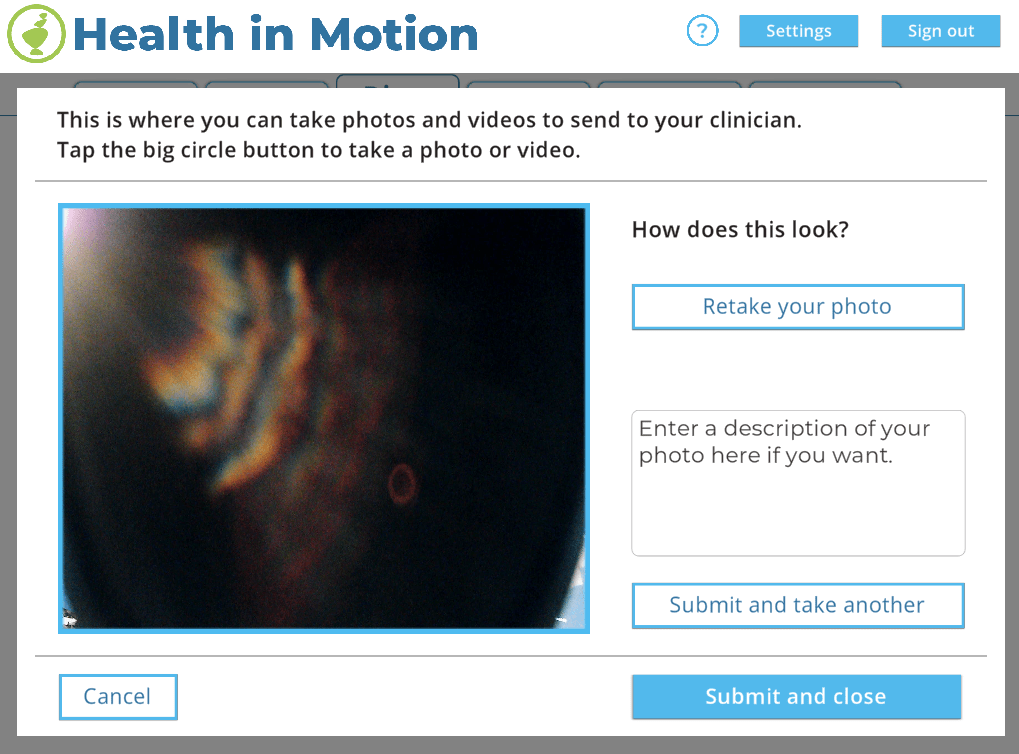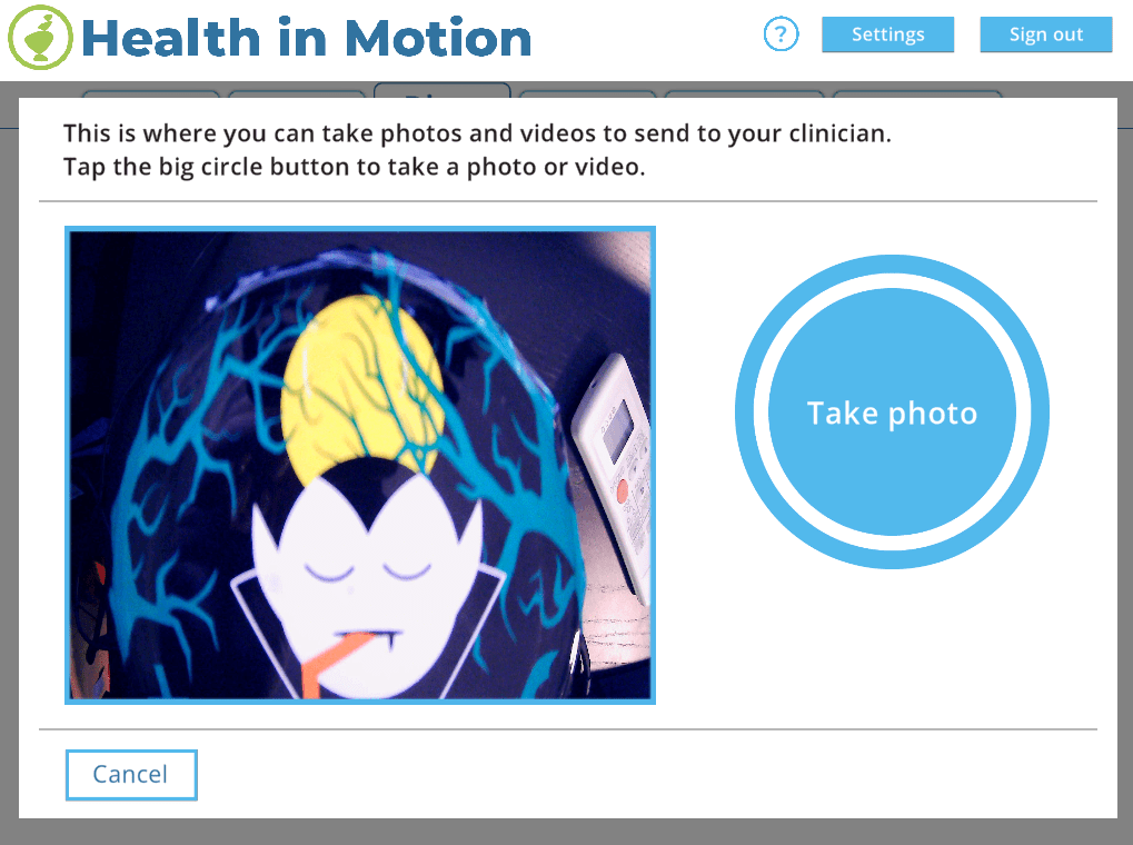 - A Capture Menu, where players can take pictures or videos and send them to their clinicians with questions and comments.