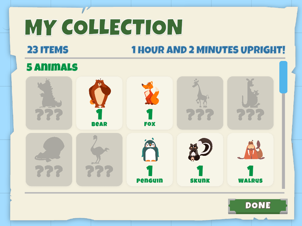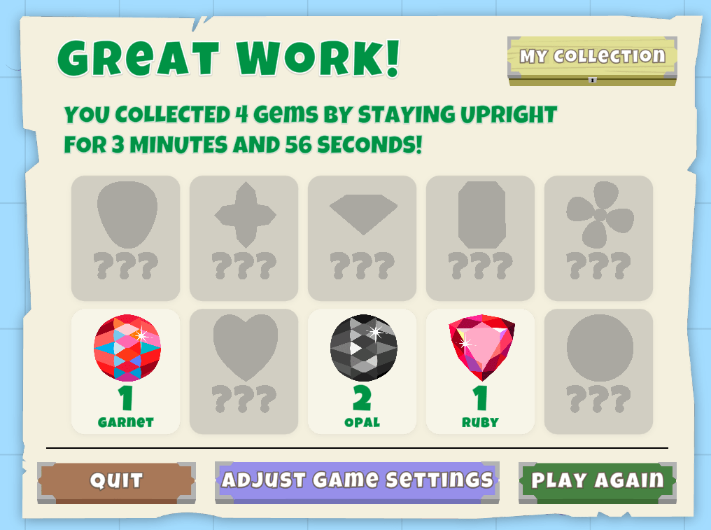 As you can see in the slideshow above, the game is about collecting different items from different locations. The game keeps track of all the items that a player has unlocked, using the Collection Menu. This menu is seen at the end of gameplay as well as from the Starting Menu, so that I player can see what else they can collect.