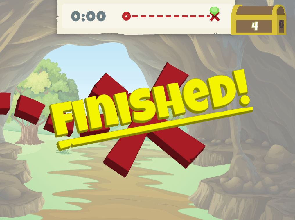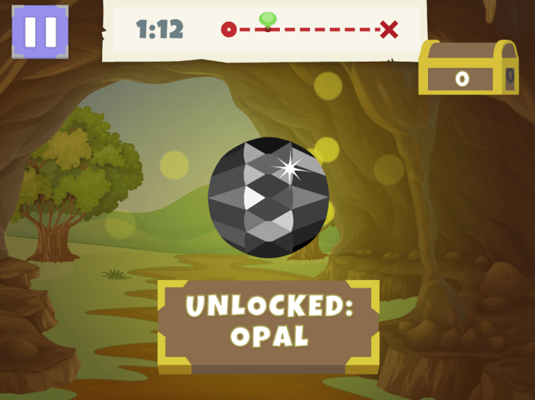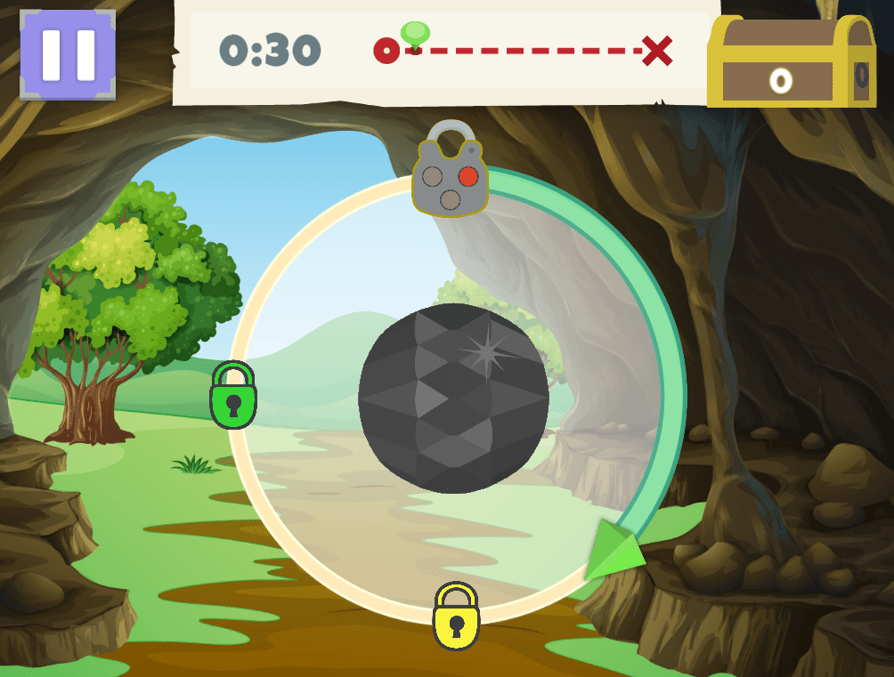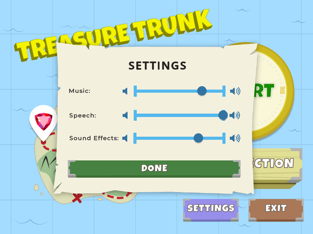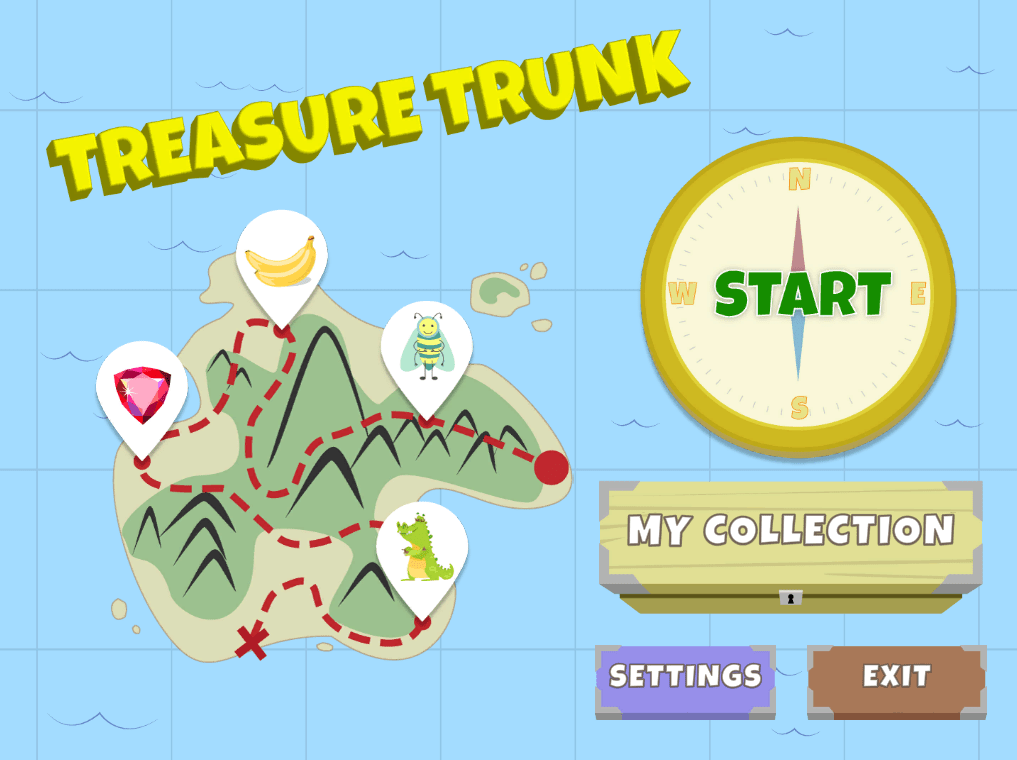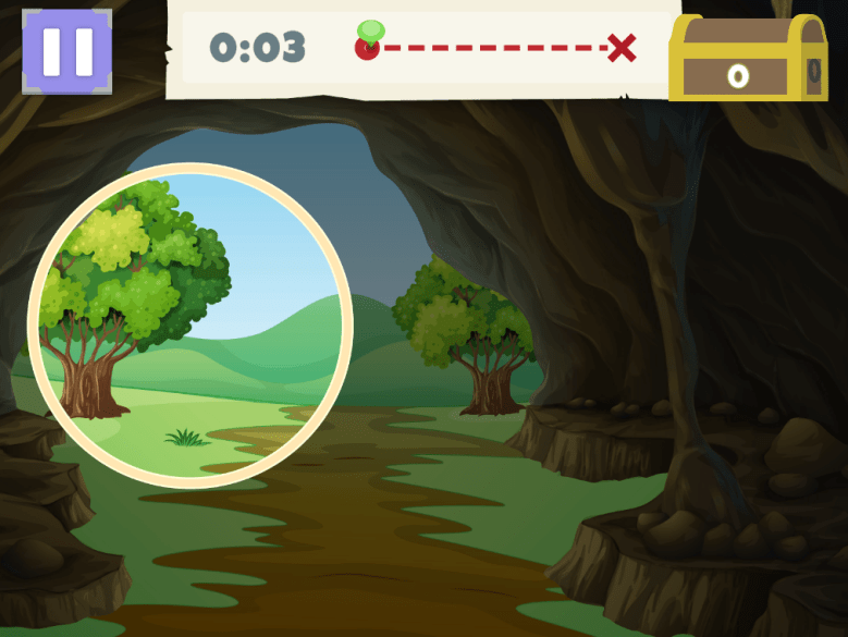 The game loop starts with a search animation, similar to looking through a telescope or magnifying glass. It scans around the screen until landing on a location where an item is hidden. Then a circular progress bar appears in the middle of the screen where a silhouette of the hidden item appears. As the child stays within their good posture threshold, the progress circle starts to fill. As the circle fills, it passes locks that unlock, which then reveal more of what the item looks like. When the circle is filled up (and all locks unlocked) the final image of the item is shown. Then an animated unlock sequence plays, where the item is thrown into the Treasure Trunk in the top-right corner; and the trunk does a fun chomp animation and sound as if it’s being fed treasure.