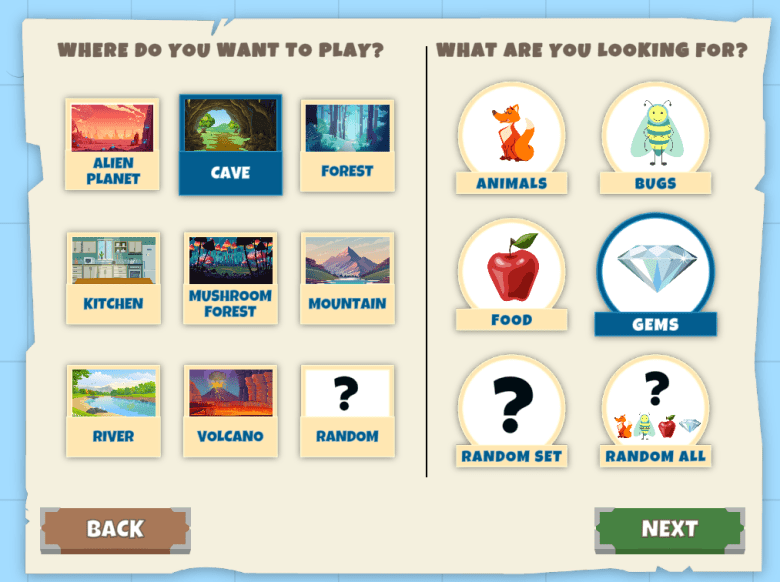 Then the more fun stuff begins. The child is able to pick which location/background they want to play in, and what kind of items they want to collect. I also programed it so that it remembers their choices for the next time they play.