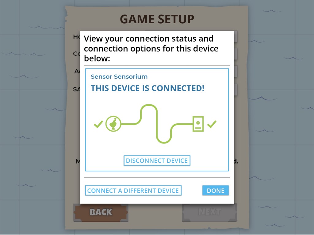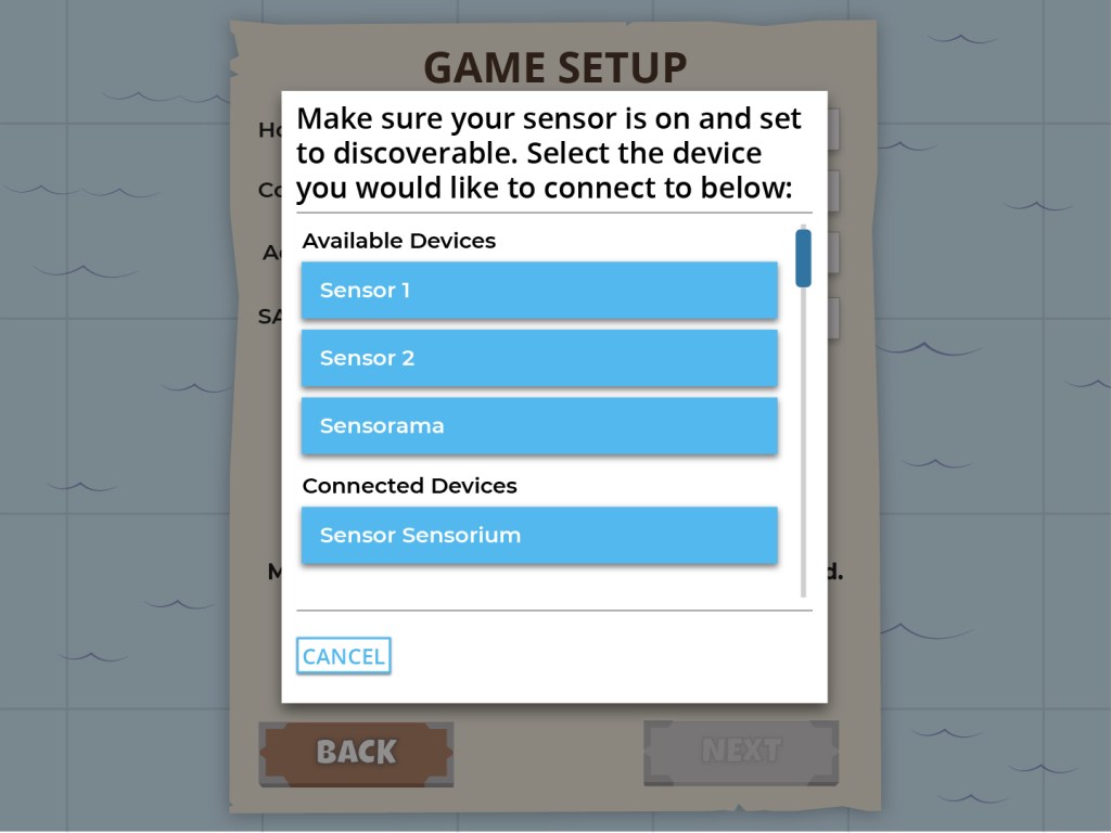 Before the player can start collecting, they have to do a view technical setup things first. This is where the clinician would help connect a sensor to the game using a Bluetooth menu. The sensor system involves custom hardware and software from a company Blue Marble worked with. It uses a sensor that’s about 1″x 1″ and connects to Raspberry Pi computer that hosts a website with a Restful API. My work involved building a bridge to that API in order to connect to the sensor and get its data.